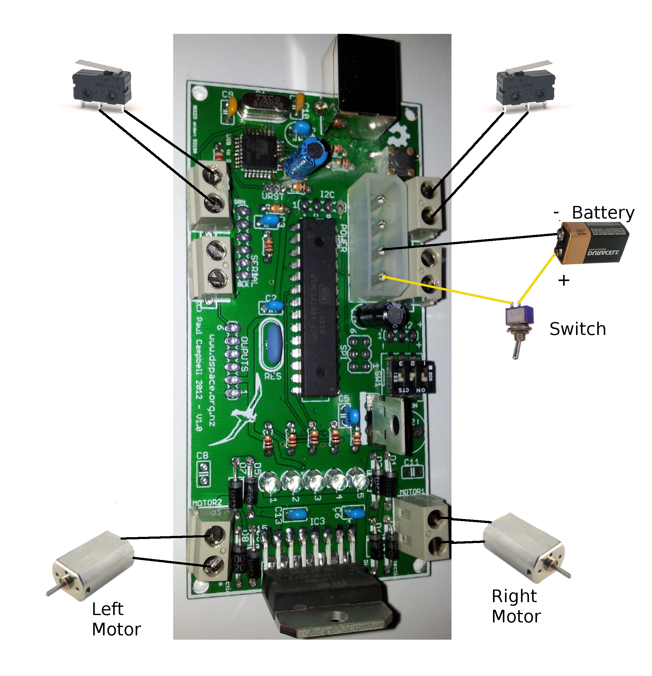 Here's an example of how to wire up the simplest robot - one with two microswitches (code for it is below)