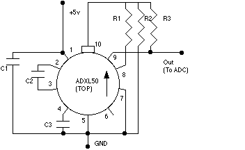 This page describes how to add an accelerometer to your flight computer. The 'standard' one everyone seems to be using is the ADXL50 from Analog Devices it even has a data sheet on line. It measures acceleration between -50G and +50G (a similar part the ADXL05 - data sheet also online - does +/- 5G) and produces an analog signal suitable for driving an ADC such as the ADC1034. To hook it up use the following diagram: